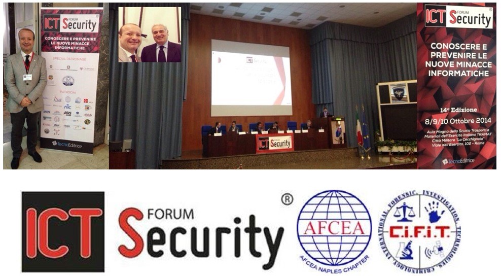 Città Militare “La Cecchignola” – Roma dall’ 8 al 10 ottobre 2014. Convegno dedicato alle tematiche della Sicurezza Informatica organizzato da Tecna Editrice. E’ ormai noto che l’aggiornamento costante e la formazione sono le soluzioni più indicate per far fronte alle problematiche derivanti dalla sicurezza informatica. E’ per questo che il Forum ICT Security nasce già nell’anno 2001 con l’unico obiettivo di diffondere la cultura della sicurezza informatica tra tutti coloro che sono potenzialmente attaccabili: il singolo cittadino, la piccola impresa, la grande azienda, fino alla Pubblica Amministrazione. Con l’ausilio dei massimi esperti del settore, Istituzionali e di Mercato, il Forum ICT Security offrirà una panoramica dettagliata esaminando tutti gli aspetti che riguardano le tematiche della Sicurezza Informatica. Aggiornamenti sui temi legali e di privacy, sulla protezione delle Infrastrutture Critiche, la protezione dei dati personali e dell’azienda, la sicurezza dei pagamenti, la crittografia, le tecnologie più all’avanguardia, e molto altro. Novità di questa edizione sono state le Demo Zone. Due aule da circa 40 posti l’una che hanno lavorato in parallelo. Ogni mezz’ora, ciclicamente, è stato possibile